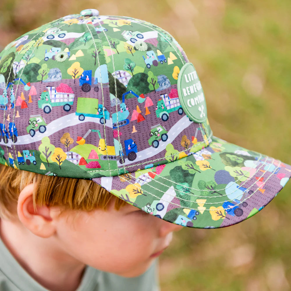 Got a little truck lover in the fam? Meet their new favourite cap! The Wheels n Roads Baseball Cap is bursting with colour and character, featuring watercolour trucks zipping down roads across a lush green background. Whether they're cruising around the backyard or leading a toy convoy at the park, this cap keeps their imagination (and head) covered.